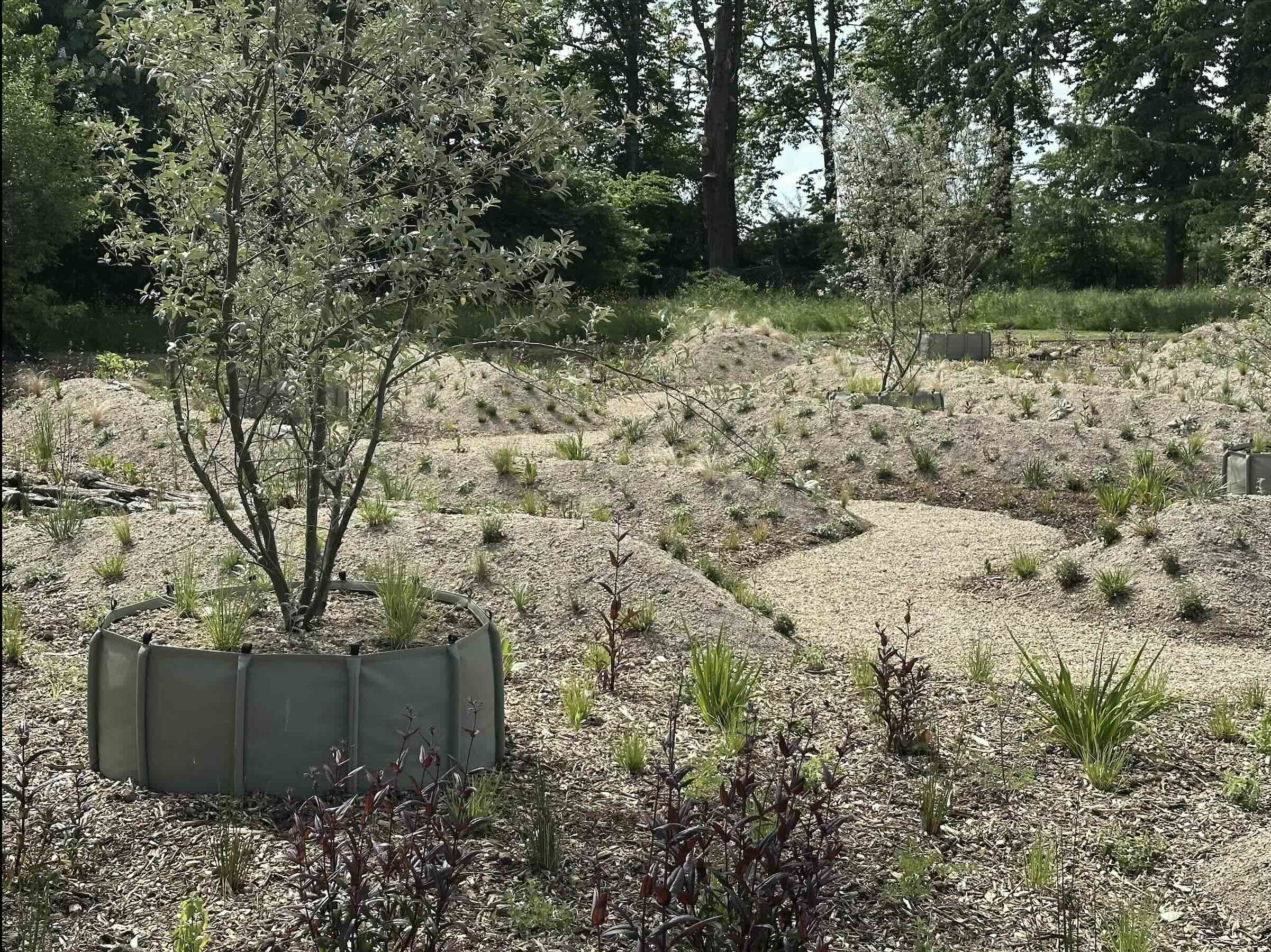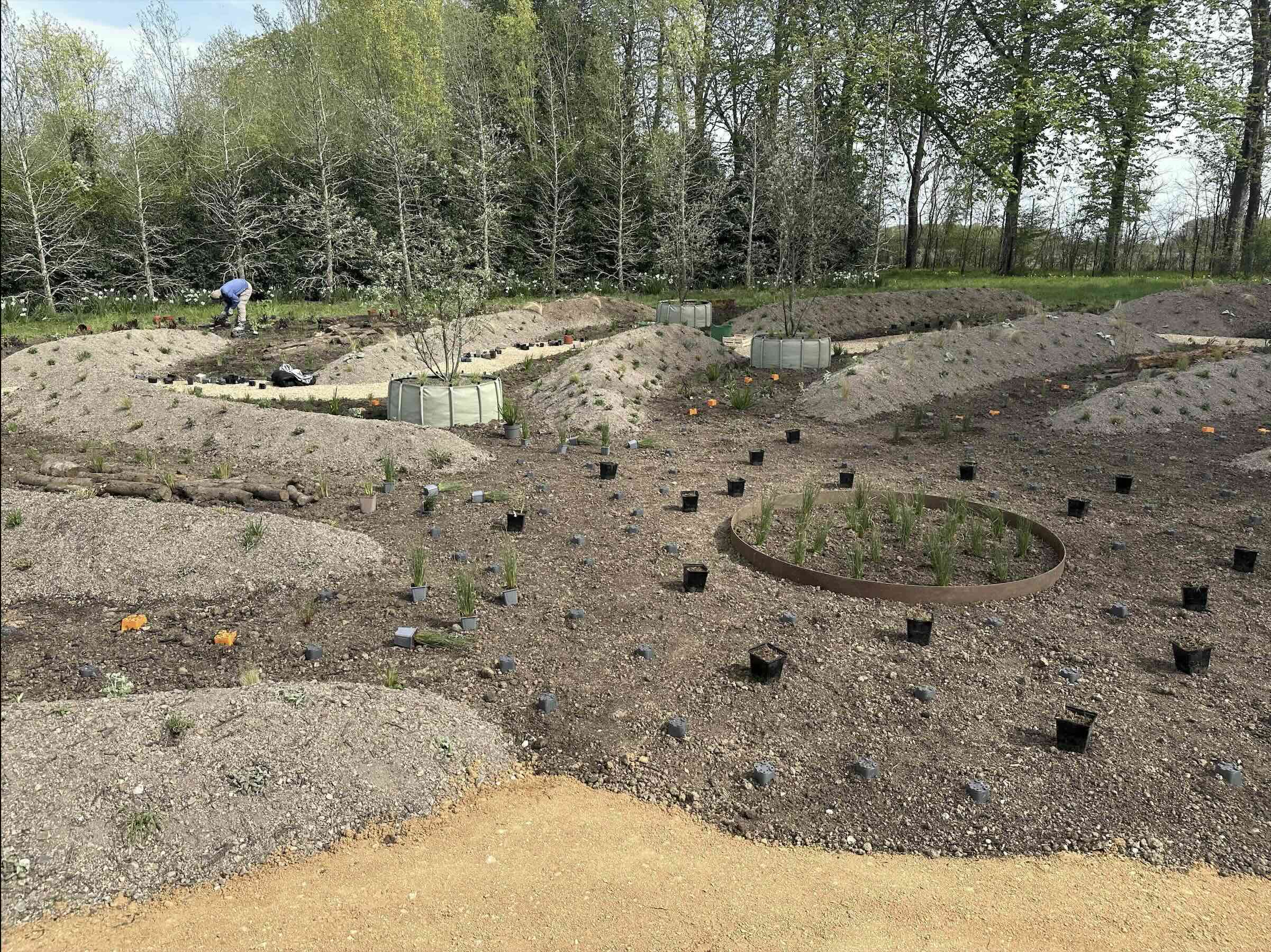 « Le Tourbillon de la Succession » de Cassian Schmidt, Bettina Jaugstetter et moi-même est un projet de land art et de jardin au Domaine de Chaumont-sur-Loire qui explore comment les plantes colonisent de nouveaux territoires et forment des communautés caractéristiques en réponse aux conditions difficiles d'un habitat. Inspiré par la dynamique de crêtes et de dépressions des paysages du lit de Loire, notre conception contraste la végétation aux feuilles grises et des explosions de magenta, violet et bleu clair contre des verts luxuriants. Les crêtes—formées par un substrat minéral et sec—accueillent des communautés steppiques et pionnières tolérantes à la sécheresse aux tons argentés, tandis que les dépressions riches en matière organique supportent des textures variées avec des accents colorés subtils. Au cœur du jardin, « l'œil du tourbillon » présente des carex et joncs adaptés aux conditions humides. Avec le temps, la plantation évoluera par succession et perturbation, invitant les visiteurs à observer l'émergence de nouveaux motifs et d'associations végétales inattendues.