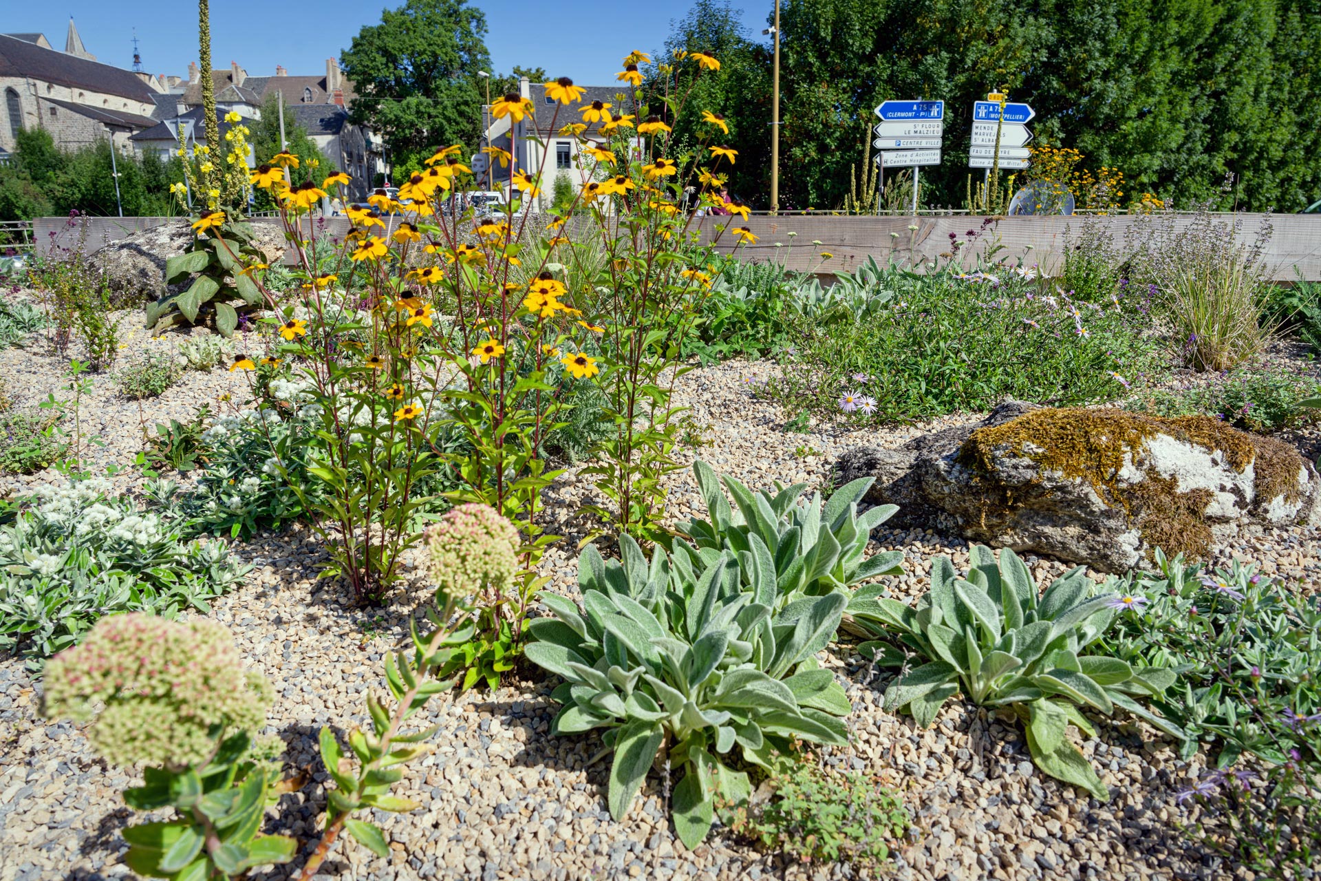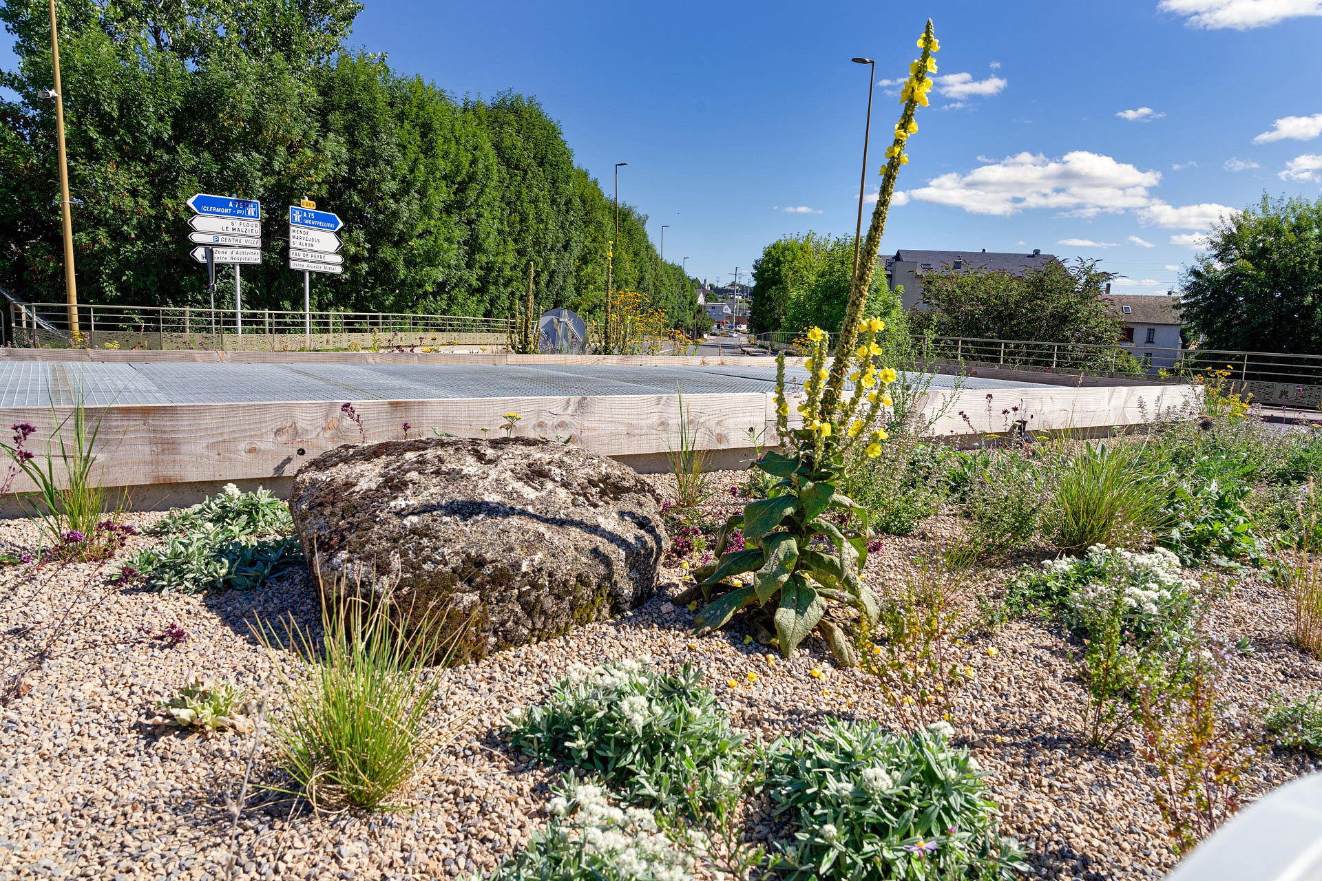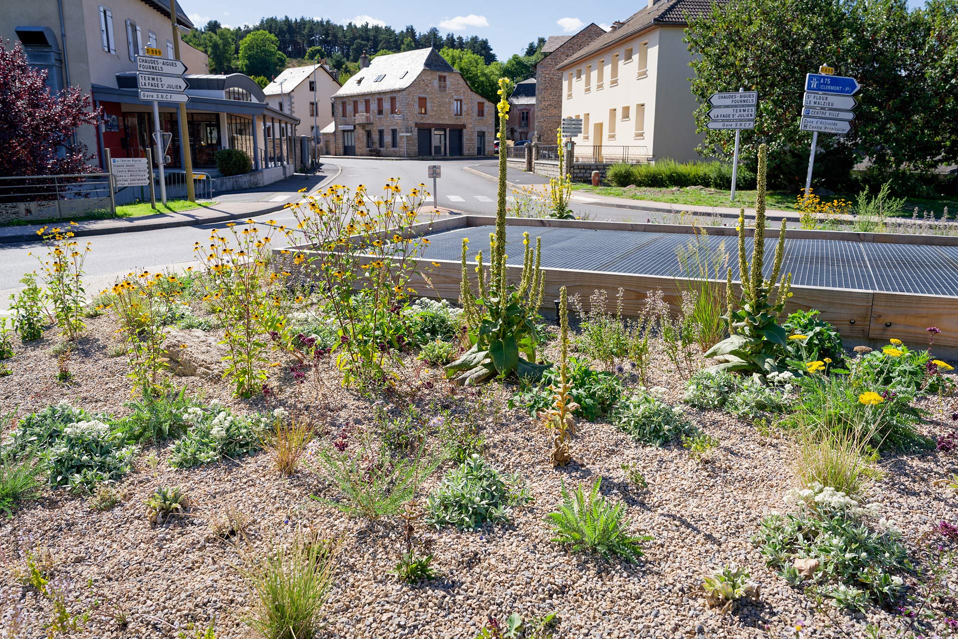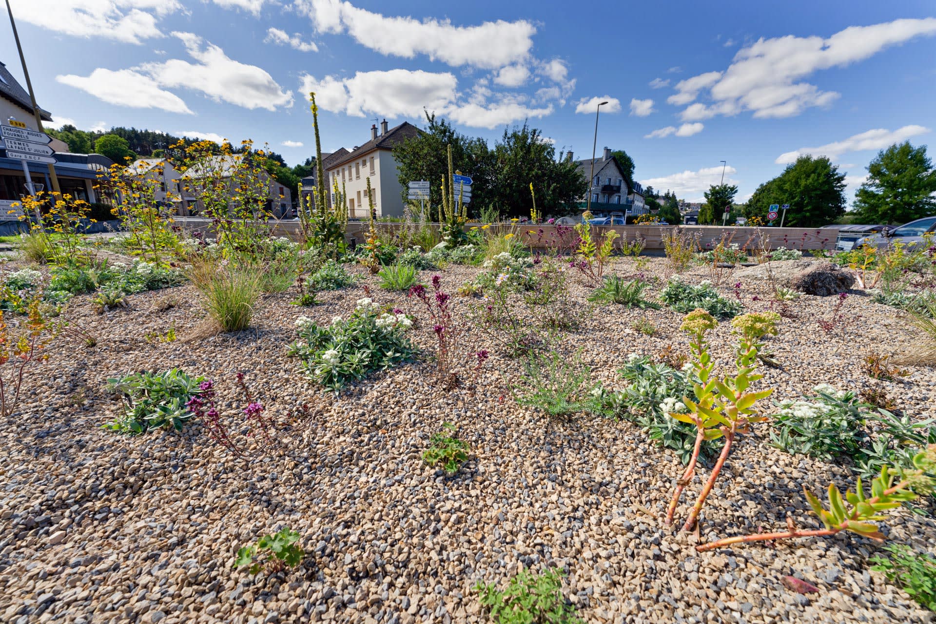 At the entrance to the small town of Saint-Chély d’Apcher, the roundabout has been transformed into a mixed perennial planting, inspired by the stunning beauty and diversity of the subalpine meadows of the Aubrac plateau. The forms and colours of the emblematic Aubrac flora — the upright yellow gentian, the deep violet of wild orchids and vetch — guided the design. Planted in a low-fertility substrate with a gravel mulch, the vegetation establishes gradually, requiring very little maintenance while encouraging resilience and seasonal change. The project was realised in collaboration with the municipality’s green space team and the botanical garden, combining local knowledge with an ecological design approach.