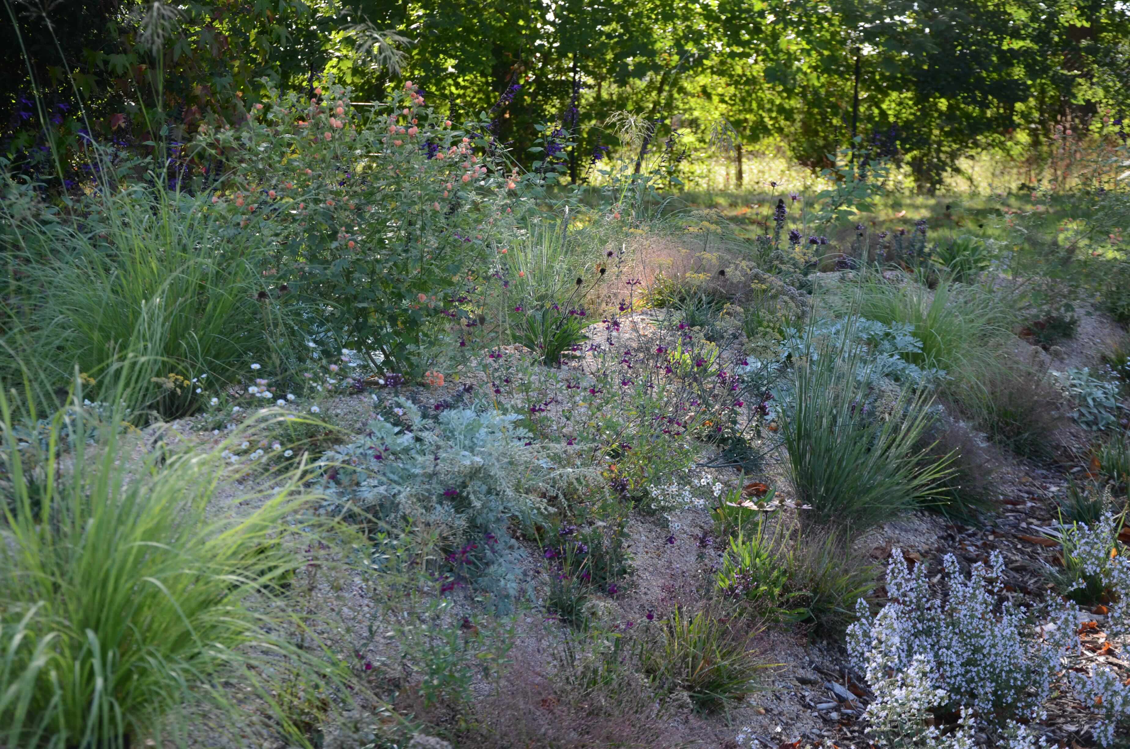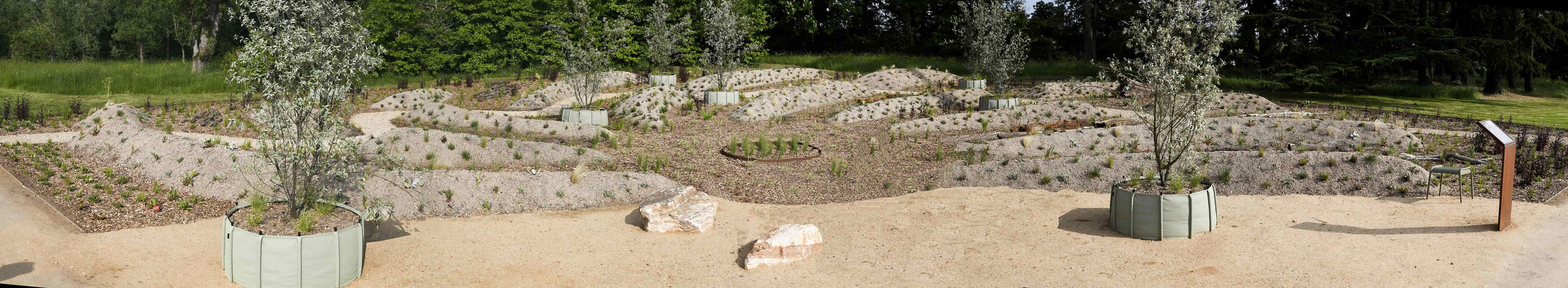 « Le Tourbillon de la Succession » de Cassian Schmidt, Bettina Jaugstetter et moi-même est un projet de land art et de jardin au Domaine de Chaumont-sur-Loire qui explore comment les plantes colonisent de nouveaux territoires et forment des communautés caractéristiques en réponse aux conditions difficiles d'un habitat. Inspiré par la dynamique de crêtes et de dépressions des paysages du lit de Loire, notre conception contraste la végétation aux feuilles grises et des explosions de magenta, violet et bleu clair contre des verts luxuriants. Les crêtes—formées par un substrat minéral et sec—accueillent des communautés steppiques et pionnières tolérantes à la sécheresse aux tons argentés, tandis que les dépressions riches en matière organique supportent des textures variées avec des accents colorés subtils. Au cœur du jardin, « l'œil du tourbillon » présente des carex et joncs adaptés aux conditions humides. Avec le temps, la plantation évoluera par succession et perturbation, invitant les visiteurs à observer l'émergence de nouveaux motifs et d'associations végétales inattendues. Anna Lena Hahn & Klaus Zimmermann